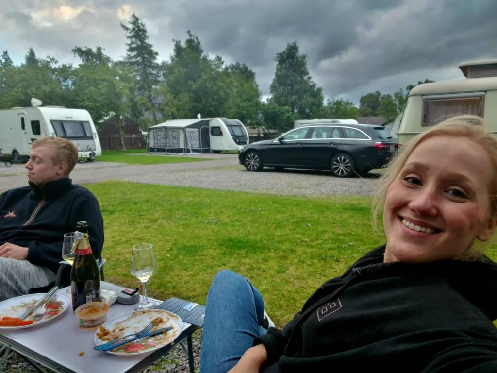 Parking up at Braemar, the rain held off long enough for us to cook pasta and eat it outside, accompanied by fizz from our wedding swag. Ending the first night, our spirits were high!
