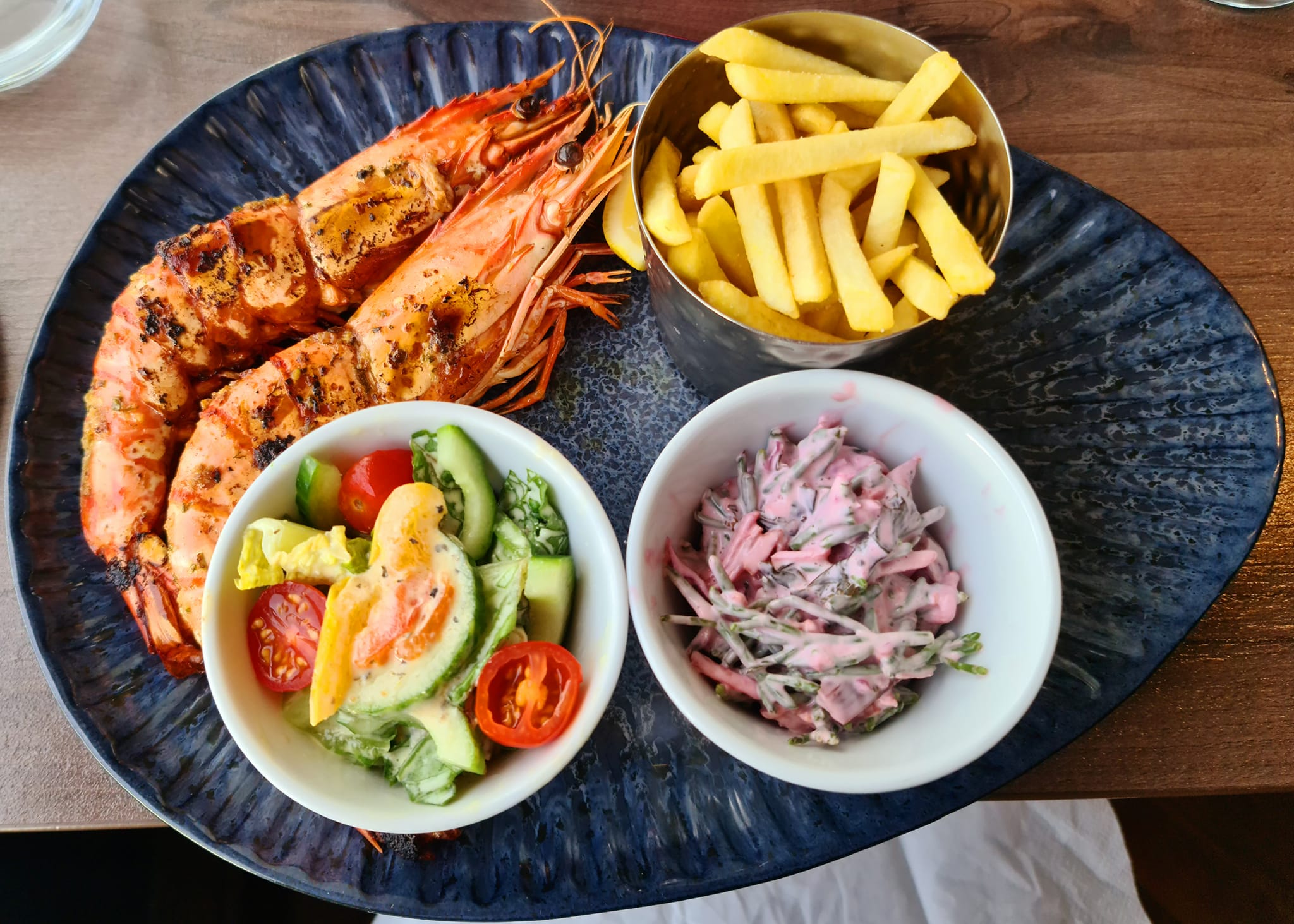 Unpacking our bags, we marveled at the space, and the luxury of an indoor bathroom. Refreshed, we hit the town to eat and drink in the sights. Wandering around the harbour, we climbed the stairs to The Waterfront Fish House restaurant, hotly tipped to have the best shellfish. After ordering the giant Banarly Black Tiger Prawns and chips, I had to agree it deserved the hype, when prawns the size of small lobsters were served with salad and chips, making it well worth the price tag!